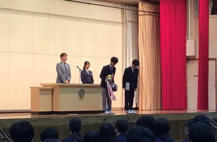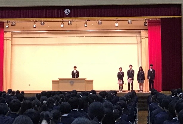 校長先生のお話の中では、「継続することの意義、やめることの勇気、新しいスタートのチャンス」について、ご自身の語学学習を取り上げてお話されていました。認証式では、新生徒会執行部(11期)が認証され、旧生徒会執行部(10期)が任期満了となりましたが、どちらの会長も校長先生の話を受けて挨拶の中に語学学習の話題を加え、和やかな雰囲気の中で交代が行われました。賞状伝達式では、美術部、男女テニス部、陸上部、新聞局が素晴らしい成績の表彰が行われました。
